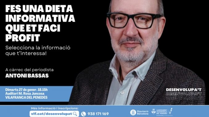 14.1.2026.- Laciutat.cat publica que el periodista Antoni Bassas será el protagonista de la próxima sesión del programa Desenvolupa’t, impulsado por el Servicio de Promoción Económica del Ayuntamiento de Vilafranca del Penedès. La cita será el martes 27 de enero, con la conferencia Haz una dieta informativa que te aproveche, una propuesta que quiere ayudar a poner orden en el consumo de información en un contexto marcado por la inmediatez y la saturación de contenidos.