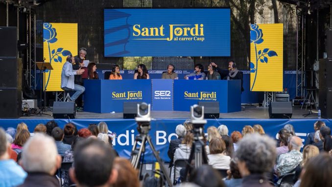 24.04.2025.- Martí Oliver escribe en elpais.com que como ya es tradición, SER Catalunya ha salido a la calle para celebrar la Diada de Sant Jordi. La programación se ha trasladado al escenario de la calle de Casp, con el añadido especial de Hora 14 de Javier Casal y La Ventana de Carles Francino, que han viajado desde Madrid. En conjunto, 12 horas de programación -de 9 de la mañana a las 21 horas- con la participación de escritores, invitados y actuaciones musicales en directo, y la compañía fiel de los oyentes, presentes sobre el asfalto del centro de Barcelona.