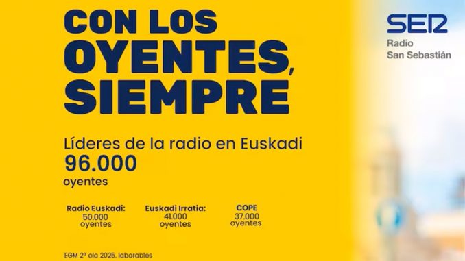 Con esta cifra, la SER supera en 46.000 oyentes a Radio Euskadi, segunda en el ranking, y más que duplica la audiencia de Euskadi Irratia, tercera opción en el territorio.