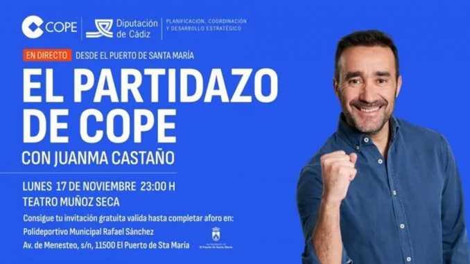 El periodista Juanma Castaño y todo su equipo llevarán el programa ‘El Partidazo de COPE’ al público gaditano en una retransmisión especial. El popular espacio radiofónico se emitirá en directo el próximo lunes, 17 de noviembre, desde El Puerto de Santa María.