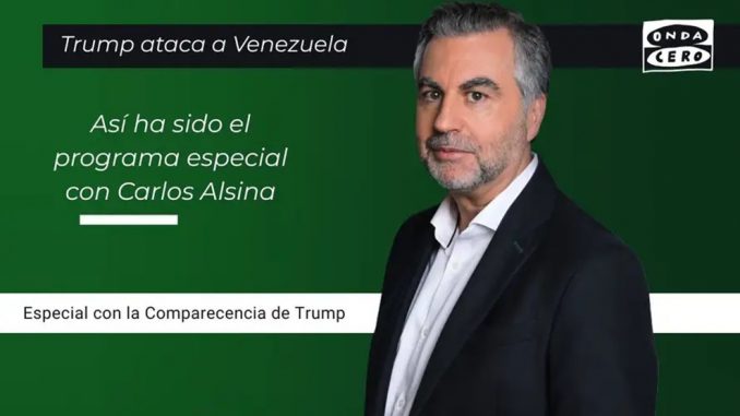 6.1.2026.- Carlos Alsina ha dirigido un programa especial por el ataque de EEUU a Venezuela en el que ha conseguido secuestrar a su presidente Nicolás Maduro. Junto a Julián Cabrera, director de informativos, ha seguido la rueda de prensa posterior de Donald Trump en la Casa Blanca. Además, ha realizado conexiones con los corresponsales en Nueva York, Agustín Alcalá, en Bruselas, Jacobo de Regoyos y en Caracas, Gabriela García. Despliegue de toda la redacción de Informativos de Onda Cero para contactar con todos los puntos de interés en Venezuela, EEUU, Europa y la comunidad venezolana en España.