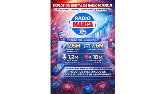 Enero de 2026 quedará marcado como un mes histórico para Radio MARCA. Coincidiendo con la celebración de su 25 aniversario, la emisora ha pulverizado todos sus registros digitales, firmando récords absolutos en escucha online, web, podcasts, redes sociales y vídeo, en una demostración clara del excelente momento que atraviesa la radio del deporte también en el entorno digital.