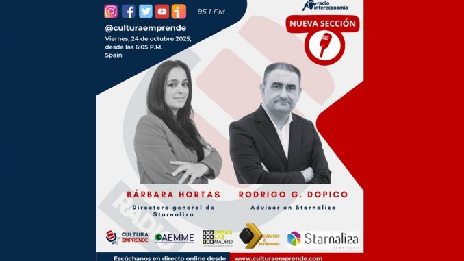 23.10.2025.- Este viernes 24 de octubre, a partir de las 18:00 horas, se estrenará en Cultura Emprende Radio una nueva sección bajo el título “Futuro Starnaliza: Dónde el pasado y futuro de las empresas se encuentran”, que se emitirá en todos los diales nacionales de Radio Intereconomía (Madrid 95.1 FM) y también en directo online a través de la web oficial de la emisora.