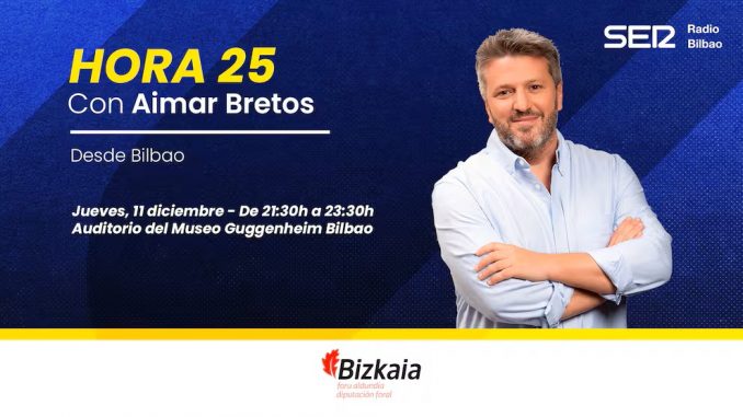 26.11.2025.- Hora 25, el programa nocturno de referencia de la Cadena SER, aterriza en Bilbao el próximo 11 de diciembre con una edición especial dedicada a uno de los grandes desafíos sociales de nuestro tiempo: la soledad no deseada. El espacio, conducido por Aimar Bretos, se emitirá en directo desde el Auditorio del Museo Guggenheim, en un evento abierto al público previo registro hasta completar aforo.