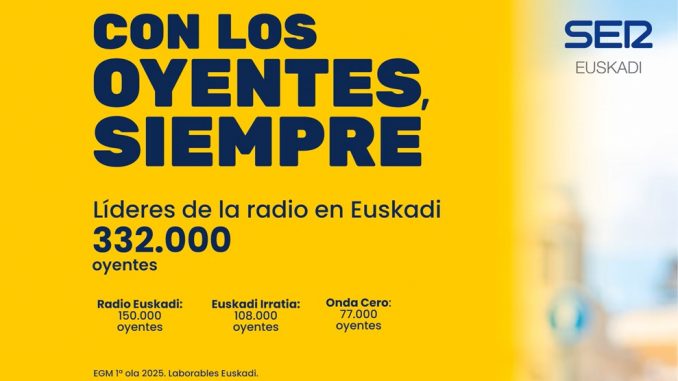 22.04.2025.- La Cadena SER logra su mejora dato de audiencia en los últimos 10 años y vuelve a ser la emisora generalista más escuchada en Euskadi con 332.000 oyentes diarios, creciendo en 38.000 respecto a la ola anterior según los datos de la primera ola del Estudio General de Medios 2025. Este dato confirma su crecimiento respecto a la ola anterior y refuerza su liderazgo frente al resto de radio habladas; Radio Euskadi con 150.000 oyentes, Euskadi Irratia 108.000, Onda Cero 77.000 y COPE 65.000. Además la Cadena SER lidera la audiencia en los tres territorios históricos.