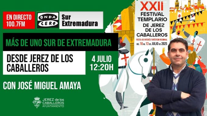 15.06.2025.- Onda Cero Sur de Extremadura estará un año más presente en el Festival Templario de Jerez de los Caballeros, «Fiesta de Interés Turístico Regional», que se celebra del 10 al 13 de julio con un programa especial que realizaremos junto a la «Torre Sangrienta» este próximo viernes 4 de julio.