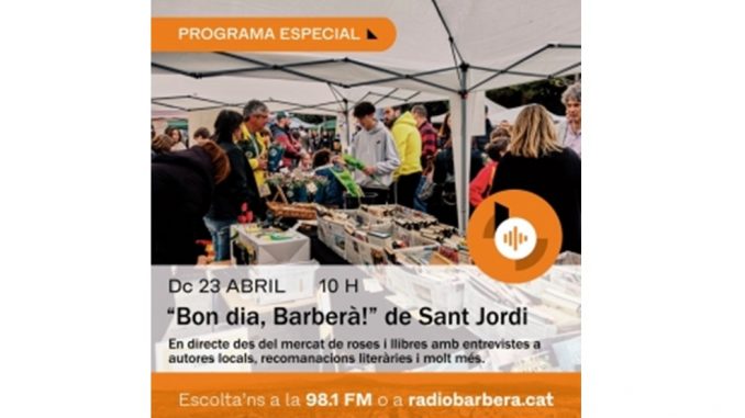 Podréis escuchar el programa especial de Sant Jordi de Ràdio Barberà este miércoles 23 en directo desde la plaza, a través de la 98.1 de la FM o en línea desde su web radiobarbera.cat y disfrutar de esta diada literaria con la compañía de la emisora municipal.
