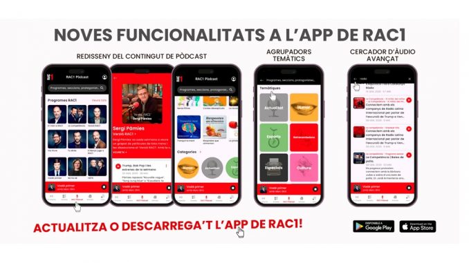 9.2.2026.- RAC 1 culmina el proyecto de renovación de la radio digital dando otro paso adelante para acercar aún más los contenidos a la audiencia. Lo hacemos con una nueva actualización de la aplicación de la emisora ​​que incluye la renovación del concepto, diseño y visualización del contenido a demanda. Por eso, ha reformulado RAC 1 Podcast y ahora se convierte en un área que incluye todo el audio de RAC 1, sea radio a la carta o podcasts originales.