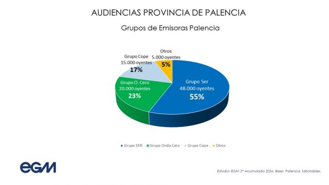 El 55% de los oyentes de radio de la provincia de Palencia escogen las emisoras del grupo de la Cadena Ser según el Estudio General de Medios en su segunda ola de este 2024. Un porcentaje que se traduce en un total de 48.000 oyentes, muy por delante de los 20.000 que acumula el grupo de Onda Cero, que se queda en un 23% o los 15.000 del grupo COPE que recibe el 17% de los oyentes de la provincia.