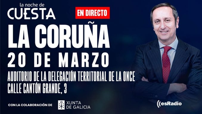 El próximo viernes 20 de Marzo, Carlos Cuesta y todo su equipo realizarán una edición muy especial de su programa La Noche de Cuesta desde La Coruña (Auditorio de la delegación territorial de la ONCE, Calle Cantón Grande, 3)