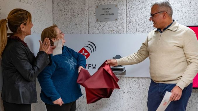 5.12.2025.- La emisora municipal ha inaugurado, oficialmente, el estudio 1 con el nombre de la periodista local Lídia Juste y ha renovado la placa del estudio 2, dedicado al periodista Josep Ferrer-Domingo. La alcaldesa de Rubí, Ana María Martínez, ha alabado las figuras de los dos comunicadores locales, en un acto íntimo en presencia de los familiares de los dos periodistas homenajeados.